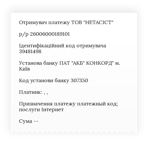 Для поповнення рахунку в будь-якому банку вам знадобиться квитанція з реквізитами і вашими даними: